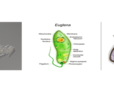 Amoeba: um protozoário que se move e se alimenta por meio de pseudópodes, que são extensões do citoplasma que podem mudar de forma. Ele tem um núcleo e um vacúolo contrátil que regula o equilíbrio de água.
