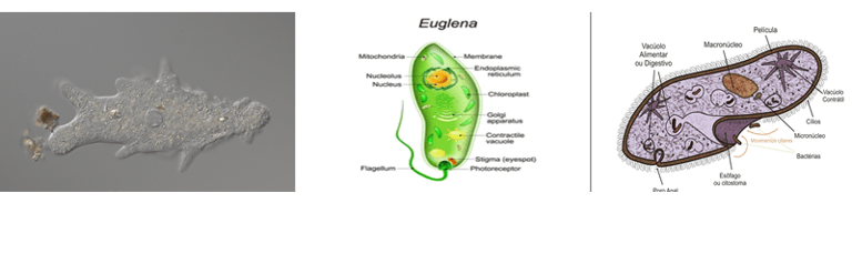 Da esquerda para a direita: Amoeba, euglena e paramecium